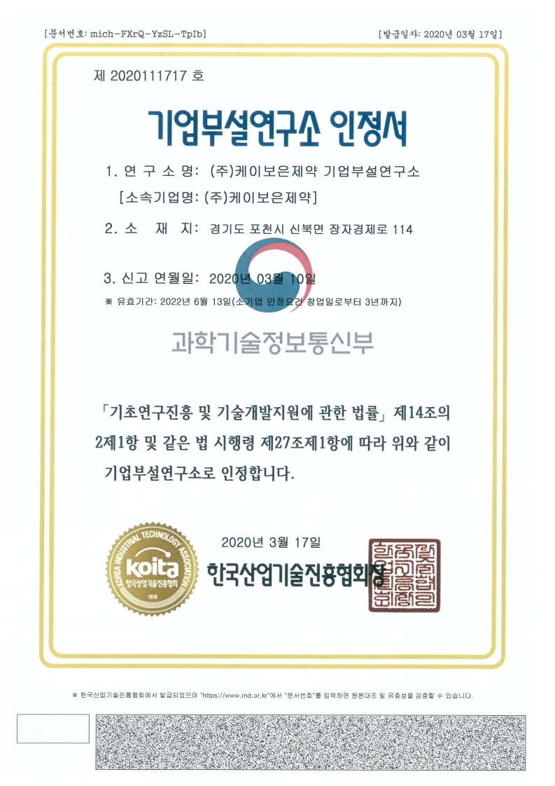 (주)케이보은제약 / 주소 : 경기 포천시 신북면 장자경제로 114